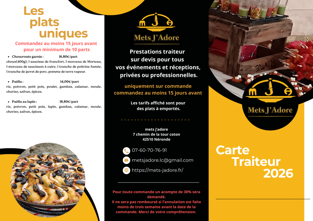 Chez Mets J’adore, nous vous accompagnons pour tous vos événements privés ou professionnels avec une cuisine généreuse, faite maison et inspirée du terroir. Chaque prestation est pensée sur mesure, avec des produits de qualité et un vrai souci du goût.